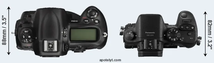 The side-by-side display below illustrates the physical size and weight of the Nikon D3X and the Panasonic GH3. The two cameras are presented according to their relative size. Three consecutive perspectives from the front, the top, and the back are available. All width, height and depth measures are rounded to the nearest millimeter.