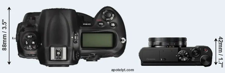 The side-by-side display below illustrates the physical size and weight of the Nikon D3X and the Panasonic LX15. The two cameras are presented according to their relative size. Three consecutive perspectives from the front, the top, and the back are available. All width, height and depth measures are rounded to the nearest millimeter.