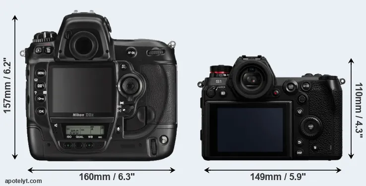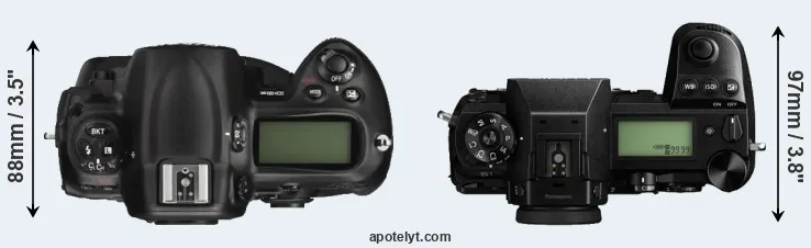 The physical size and weight of the Nikon D3X and the Panasonic S1 are illustrated in the side-by-side display below. The two cameras are presented according to their relative size. Three successive views from the front, the top, and the rear are shown. All size dimensions are rounded to the nearest millimeter.