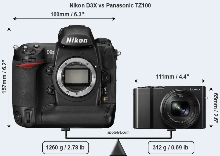 The side-by-side display below illustrates the physical size and weight of the Nikon D3X and the Panasonic TZ100. The two cameras are presented according to their relative size. Three successive views from the front, the top, and the rear are shown. All size dimensions are rounded to the nearest millimeter.
