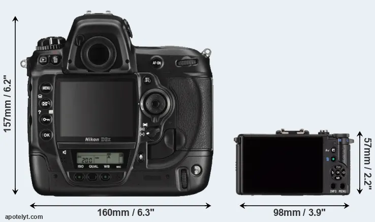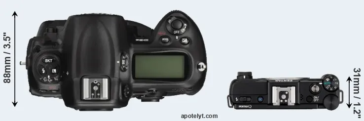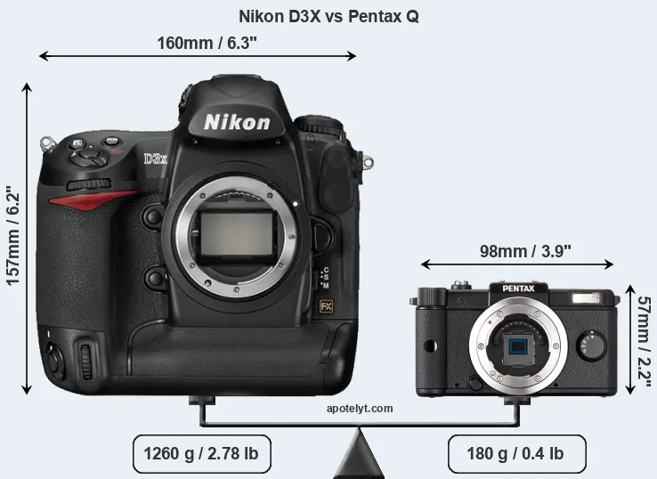 An illustration of the physical size and weight of the Nikon D3X and the Pentax Q is provided in the side-by-side display below. The two cameras are presented according to their relative size. Three consecutive views from the front, the top, and the rear side are shown. All width, height and depth dimensions are rounded to the nearest millimeter.