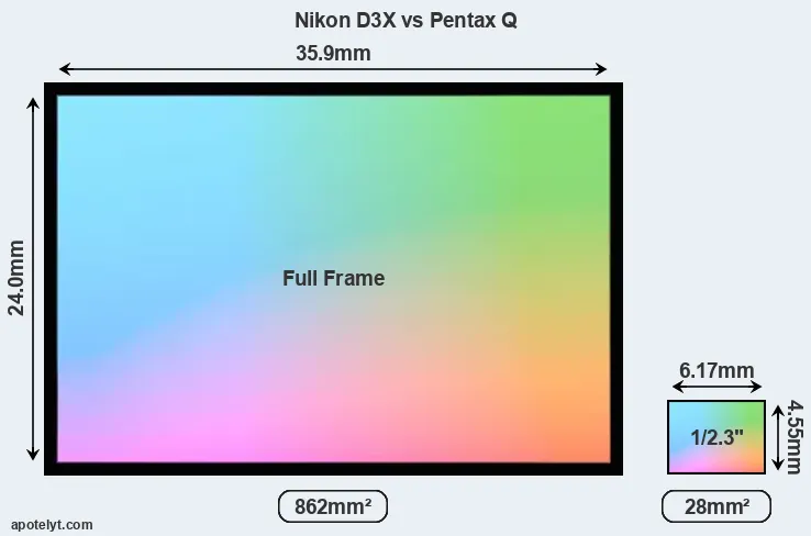 Of the two cameras under consideration, the Nikon D3X features a full frame sensor and the Pentax Q a 1/2.3-inch sensor. The sensor area in the Pentax Q is 97 percent smaller. As a result of these sensor size differences, the cameras have a format factor of, respectively, 1.0 and 5.6. The sensor in the D3X has a native 3:2 aspect ratio, while the one in the Pentax Q offers a 4:3 aspect.
