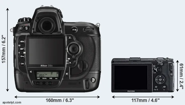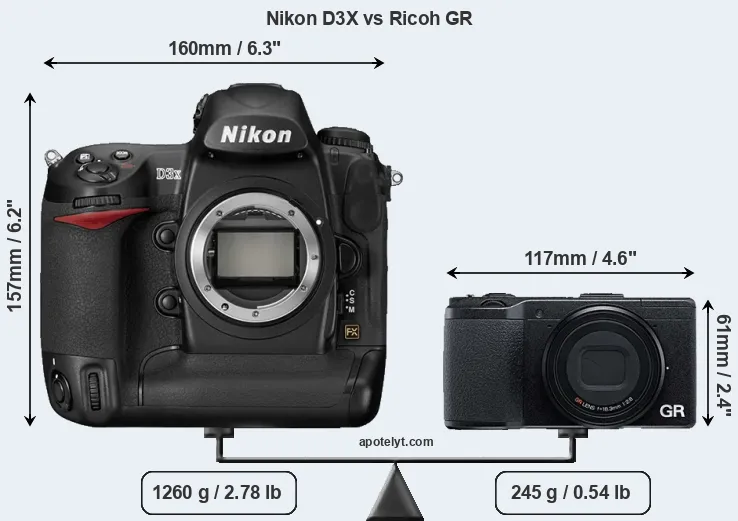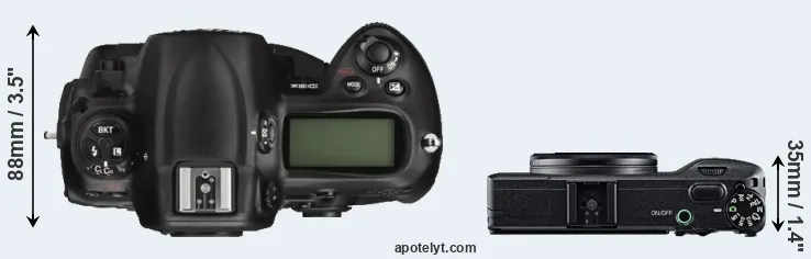 The side-by-side display below illustrates the physical size and weight of the Nikon D3X and the Ricoh GR. The two cameras are presented according to their relative size. Three consecutive views from the front, the top, and the rear side are shown. All width, height and depth measures are rounded to the nearest millimeter.