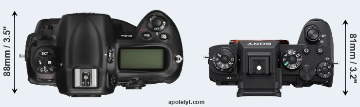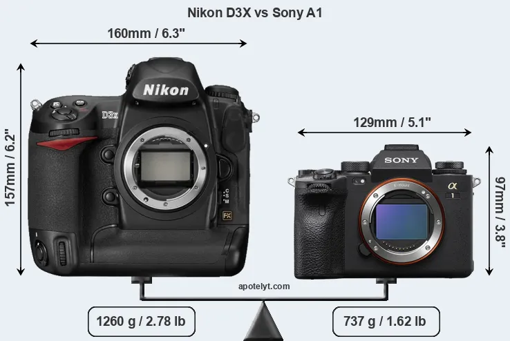 The side-by-side display below illustrates the physical size and weight of the Nikon D3X and the Sony A1. The two cameras are presented according to their relative size. Three successive views from the front, the top, and the rear are shown. All size dimensions are rounded to the nearest millimeter.