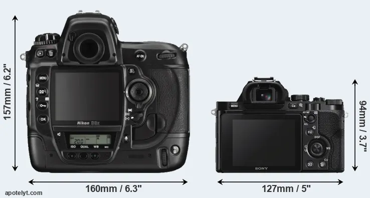 The side-by-side display below illustrates the physical size and weight of the Nikon D3X and the Sony A7S. The two cameras are presented according to their relative size. Three consecutive perspectives from the front, the top, and the back are available. All size dimensions are rounded to the nearest millimeter.