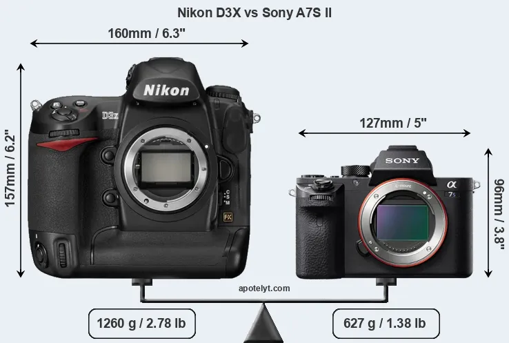 The physical size and weight of the Nikon D3X and the Sony A7S II are illustrated in the side-by-side display below. The two cameras are presented according to their relative size. Three successive views from the front, the top, and the rear are shown. All width, height and depth measures are rounded to the nearest millimeter.