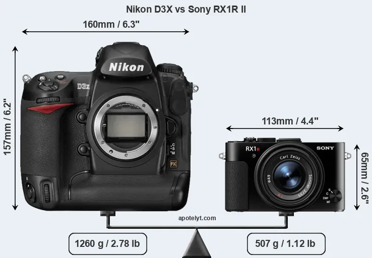 The side-by-side display below illustrates the physical size and weight of the Nikon D3X and the Sony RX1R II. The two cameras are presented according to their relative size. Three consecutive perspectives from the front, the top, and the back are available. All width, height and depth measures are rounded to the nearest millimeter.