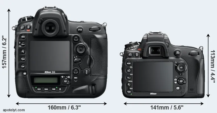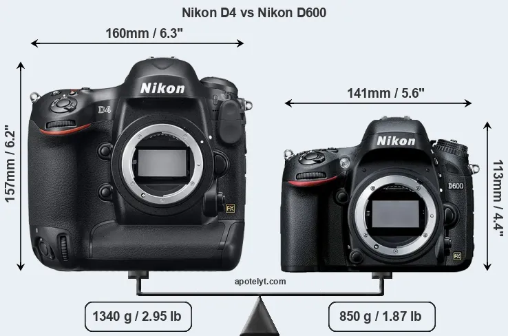 The side-by-side display below illustrates the physical size and weight of the Nikon D4 and the Nikon D600. The two cameras are presented according to their relative size. Three consecutive perspectives from the front, the top, and the back are available. All width, height and depth measures are rounded to the nearest millimeter.