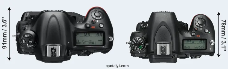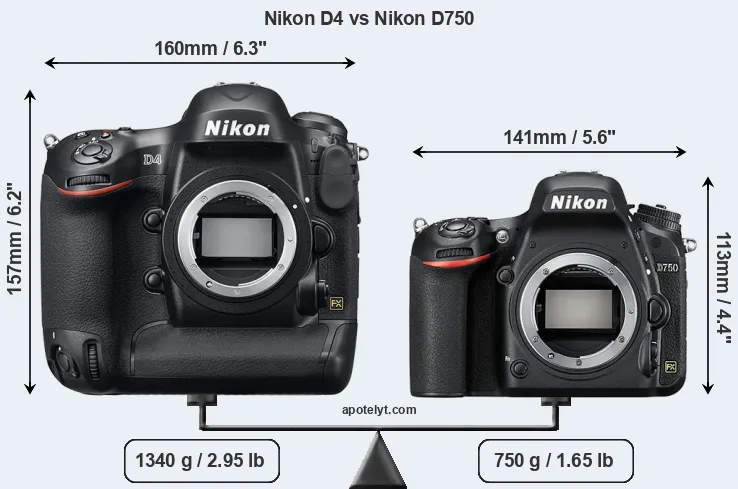 The side-by-side display below illustrates the physical size and weight of the Nikon D4 and the Nikon D750. The two cameras are presented according to their relative size. Three consecutive perspectives from the front, the top, and the back are available. All width, height and depth measures are rounded to the nearest millimeter.