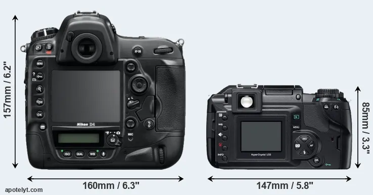 The physical size and weight of the Nikon D4 and the Olympus E-300 are illustrated in the side-by-side display below. The two cameras are presented according to their relative size. Three consecutive perspectives from the front, the top, and the back are available. All width, height and depth dimensions are rounded to the nearest millimeter.