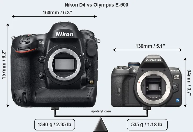 An illustration of the physical size and weight of the Nikon D4 and the Olympus E-600 is provided in the side-by-side display below. The two cameras are presented according to their relative size. Three successive views from the front, the top, and the rear are shown. All width, height and depth measures are rounded to the nearest millimeter.