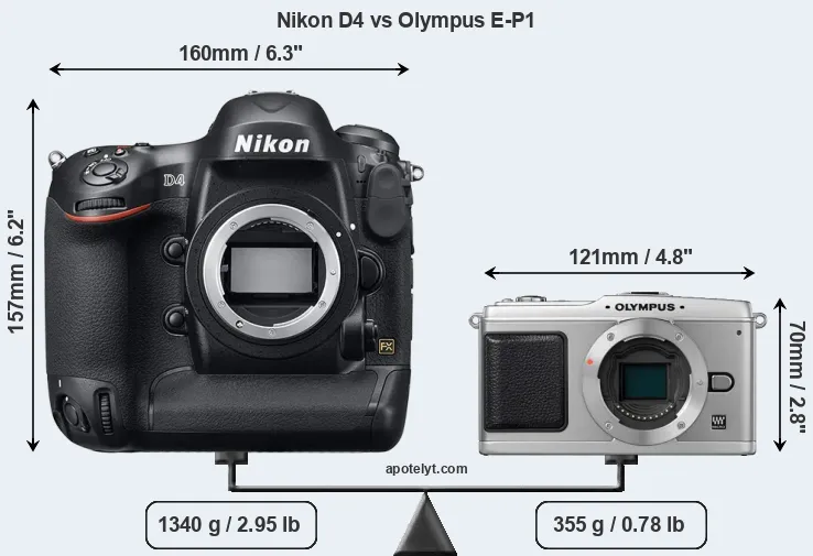 If the front view area (width x height) of the cameras is taken as an aggregate measure of their size, the Olympus E-P1 is considerably smaller (66 percent) than the Nikon D4. Moreover, the E-P1 is substantially lighter (74 percent) than the D4. It is worth mentioning in this context that the D4 is splash and dust resistant, while the E-P1 does not feature any corresponding weather-sealing.