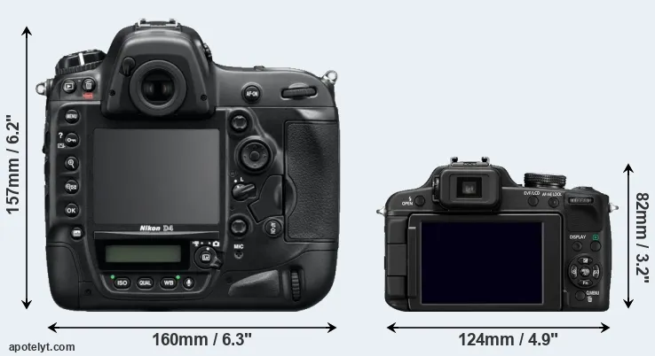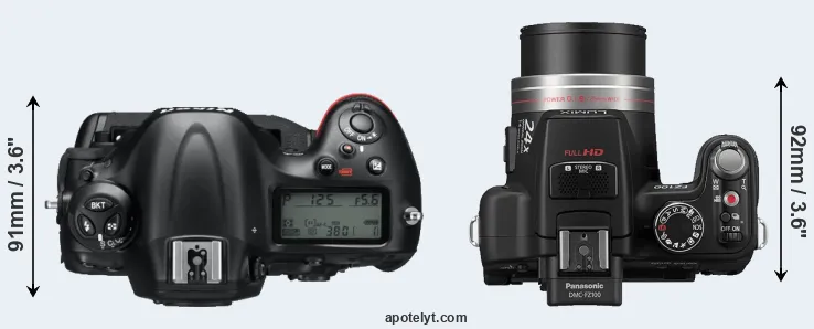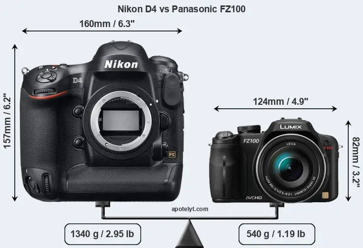 The physical size and weight of the Nikon D4 and the Panasonic FZ100 are illustrated in the side-by-side display below. The two cameras are presented according to their relative size. Three consecutive perspectives from the front, the top, and the back are available. All width, height and depth dimensions are rounded to the nearest millimeter.