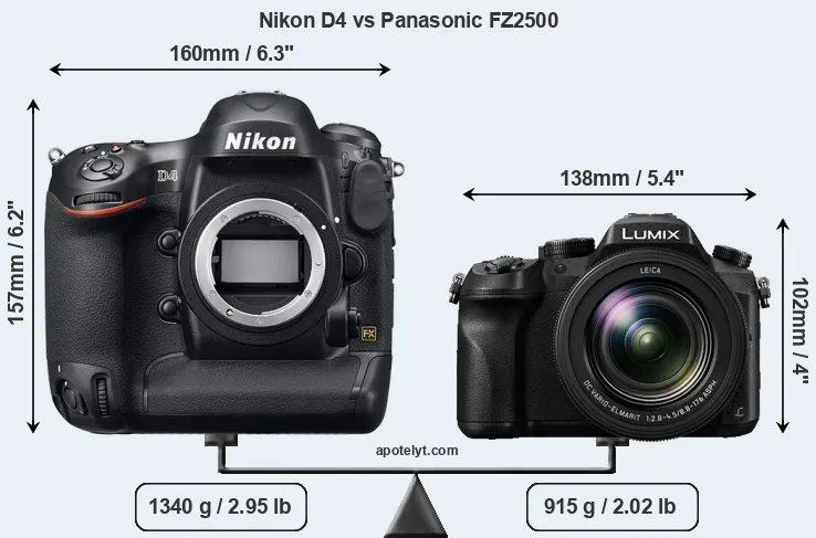 If the front view area (width x height) of the cameras is taken as an aggregate measure of their size, the Panasonic FZ2500 is considerably smaller (44 percent) than the Nikon D4. It is worth mentioning in this context that the D4 is splash and dust resistant, while the FZ2500 does not feature any corresponding weather-sealing.