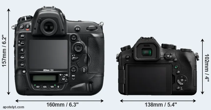 Going beyond this snapshot of core features and characteristics, what are the differences between the Nikon D4 and the Panasonic Lumix DMC-FZ2500? Which one should you buy? Read on to find out how these two cameras compare with respect to their body size, their imaging sensors, their shooting features, their input-output connections, and their reception by expert reviewers.