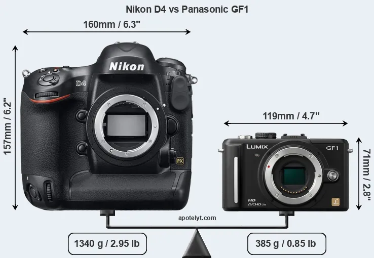 If the front view area (width x height) of the cameras is taken as an aggregate measure of their size, the Panasonic GF1 is considerably smaller (66 percent) than the Nikon D4. Moreover, the GF1 is substantially lighter (71 percent) than the D4. It is worth mentioning in this context that the D4 is splash and dust resistant, while the GF1 does not feature any corresponding weather-sealing.