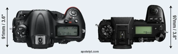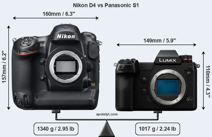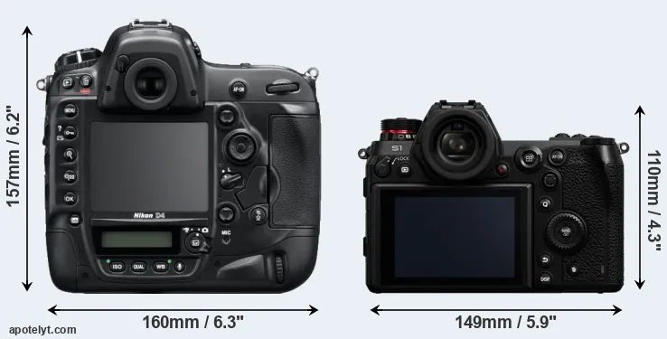 An illustration of the physical size and weight of the Nikon D4 and the Panasonic S1 is provided in the side-by-side display below. The two cameras are presented according to their relative size. Three consecutive perspectives from the front, the top, and the back are available. All width, height and depth measures are rounded to the nearest millimeter.