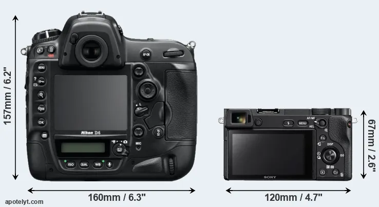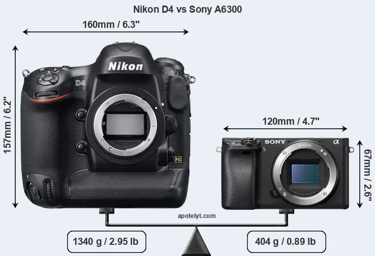 The side-by-side display below illustrates the physical size and weight of the Nikon D4 and the Sony A6300. The two cameras are presented according to their relative size. Three successive views from the front, the top, and the rear are shown. All size dimensions are rounded to the nearest millimeter.