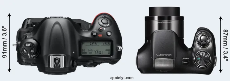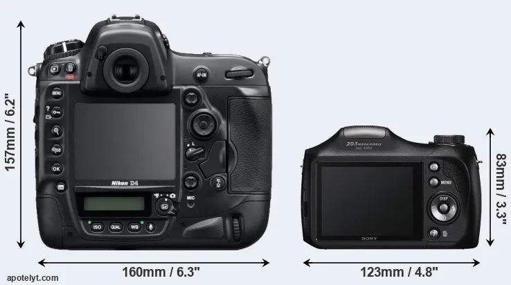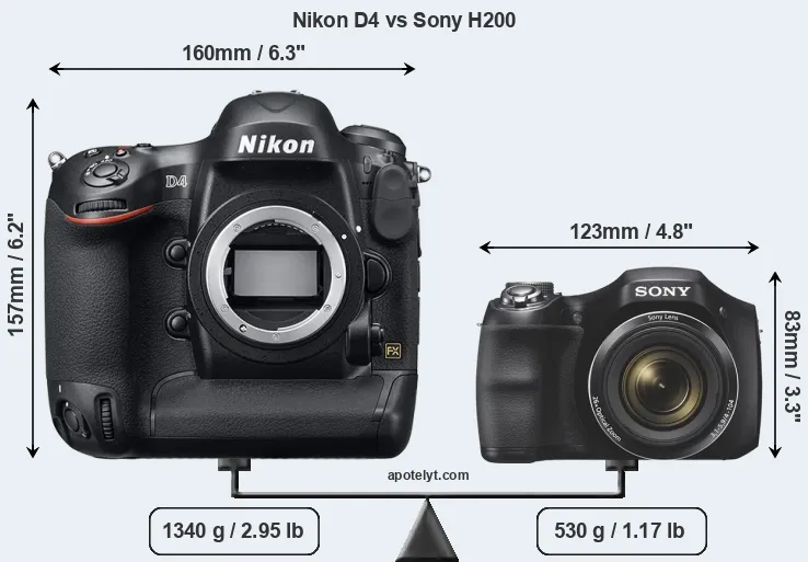 The side-by-side display below illustrates the physical size and weight of the Nikon D4 and the Sony H200. The two cameras are presented according to their relative size. Three consecutive perspectives from the front, the top, and the back are available. All width, height and depth measures are rounded to the nearest millimeter.