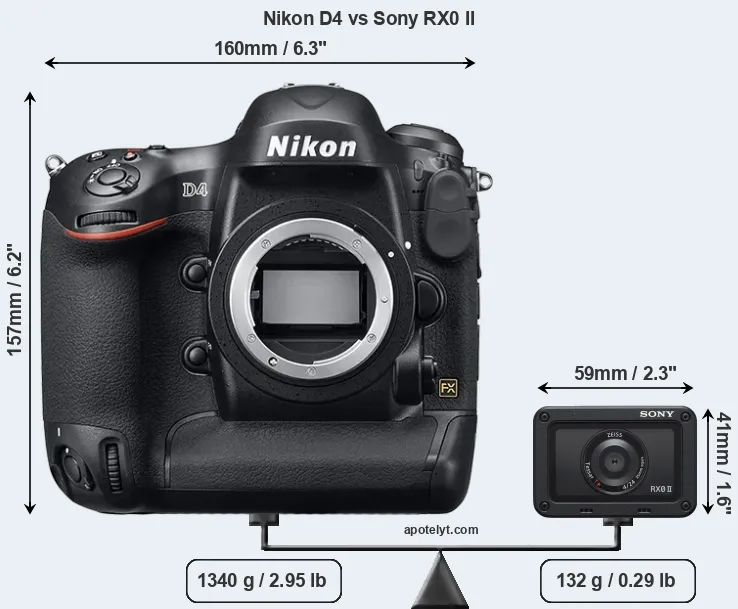 The above size and weight comparisons are to some extent incomplete and possibly misleading, as the RX0 II has a lens built in, whereas the D4 is an interchangeable lens camera that requires a separate lens. Attaching the latter will add extra weight and bulk to the setup. You can compare the optics available for the D4 and their specifications in the Nikon Lens Catalog.