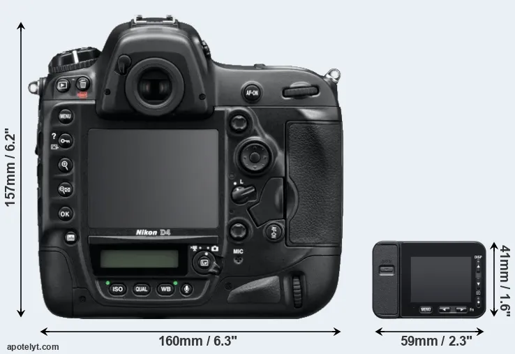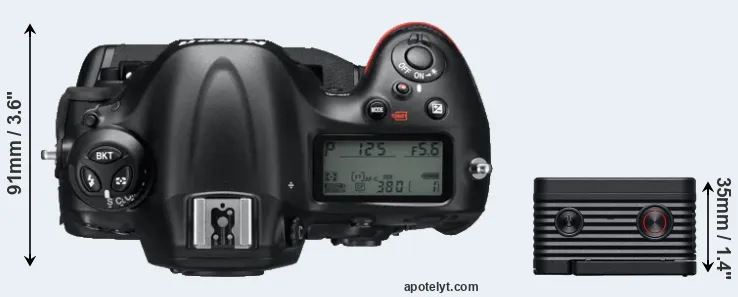 The physical size and weight of the Nikon D4 and the Sony RX0 II are illustrated in the side-by-side display below. The two cameras are presented according to their relative size. Three consecutive views from the front, the top, and the rear side are shown. All size dimensions are rounded to the nearest millimeter.