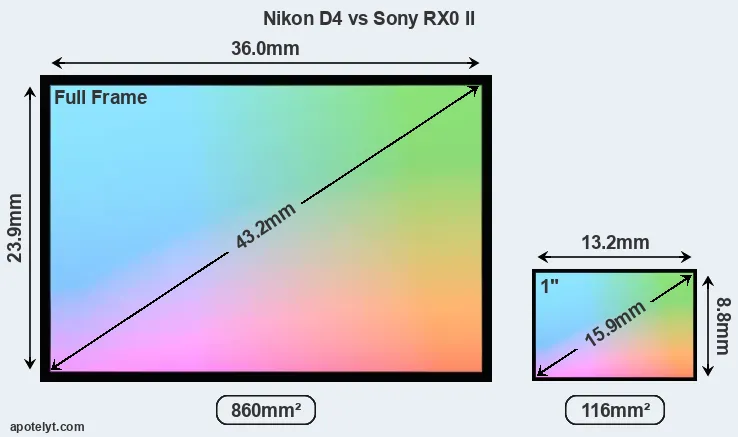 Of the two cameras under consideration, the Nikon D4 features a full frame sensor and the Sony RX0 II an one-inch sensor. The sensor area in the RX0 II is 87 percent smaller. As a result of these sensor size differences, the cameras have a format factor of, respectively, 1.0 and 2.7. Both cameras have a native aspect ratio (sensor width to sensor height) of 3:2.