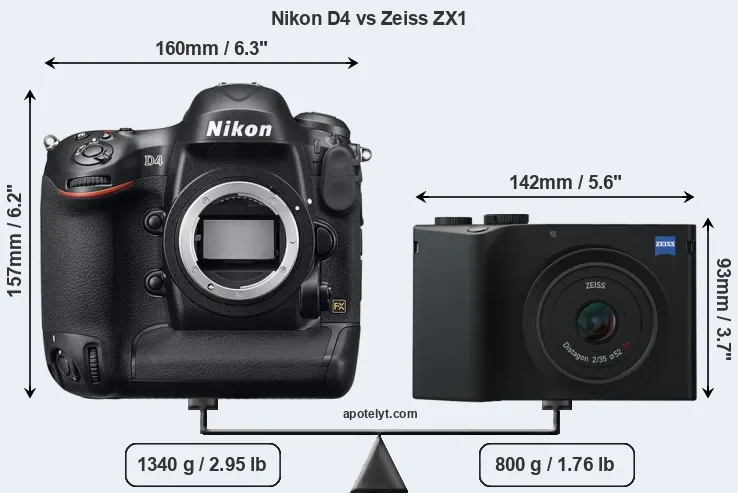 If the front view area (width x height) of the cameras is taken as an aggregate measure of their size, the Zeiss ZX1 is considerably smaller (47 percent) than the Nikon D4. It is worth mentioning in this context that the D4 is splash and dust resistant, while the ZX1 does not feature any corresponding weather-sealing.