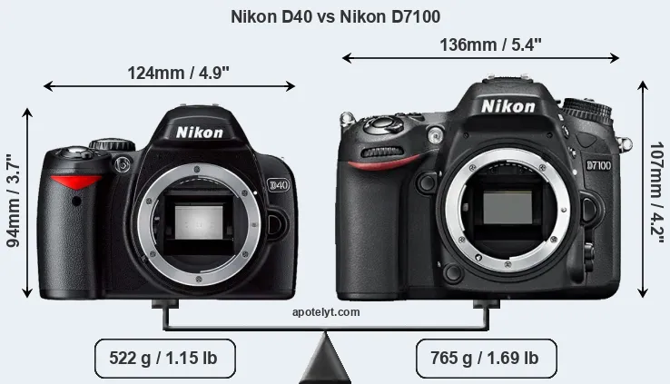 An illustration of the physical size and weight of the Nikon D40 and the Nikon D7100 is provided in the side-by-side display below. The two cameras are presented according to their relative size. Three consecutive views from the front, the top, and the rear side are shown. All width, height and depth measures are rounded to the nearest millimeter.