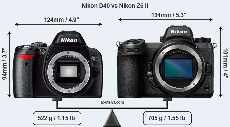 If the front view area (width x height) of the cameras is taken as an aggregate measure of their size, the Nikon Z6 II is notably larger (16 percent) than the Nikon D40. Moreover, the Z6 II is substantially heavier (35 percent) than the D40. It is noteworthy in this context that the Z6 II is splash and dust-proof, while the D40 does not feature any corresponding weather-sealing.