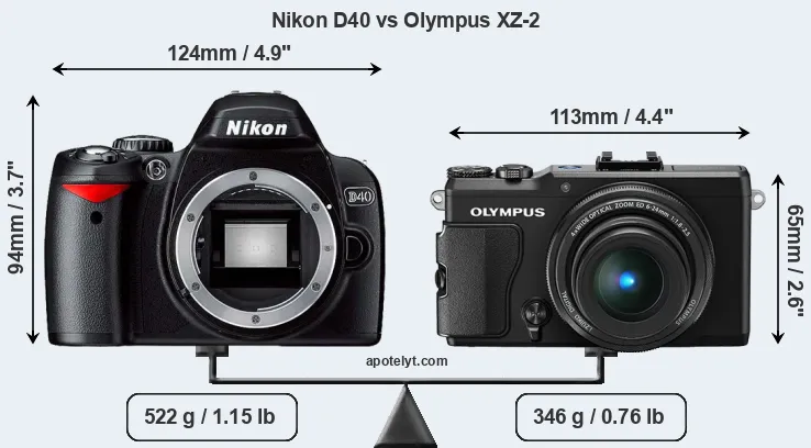 The side-by-side display below illustrates the physical size and weight of the Nikon D40 and the Olympus XZ-2. The two cameras are presented according to their relative size. Three consecutive views from the front, the top, and the rear side are shown. All width, height and depth measures are rounded to the nearest millimeter.