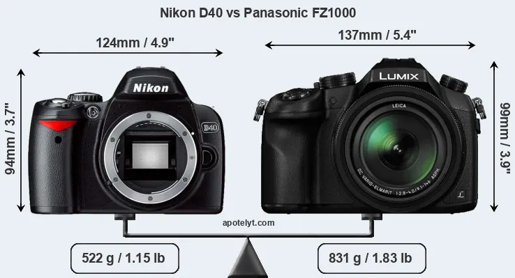 The side-by-side display below illustrates the physical size and weight of the Nikon D40 and the Panasonic FZ1000. The two cameras are presented according to their relative size. Three consecutive perspectives from the front, the top, and the back are available. All size dimensions are rounded to the nearest millimeter.