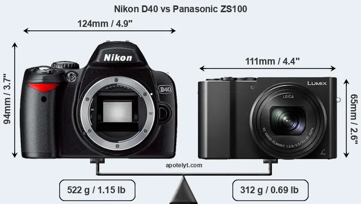 The side-by-side display below illustrates the physical size and weight of the Nikon D40 and the Panasonic ZS100. The two cameras are presented according to their relative size. Three consecutive views from the front, the top, and the rear side are shown. All width, height and depth dimensions are rounded to the nearest millimeter.