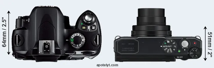 The side-by-side display below illustrates the physical size and weight of the Nikon D40 and the Pentax MX-1. The two cameras are presented according to their relative size. Three consecutive views from the front, the top, and the rear side are shown. All size dimensions are rounded to the nearest millimeter.