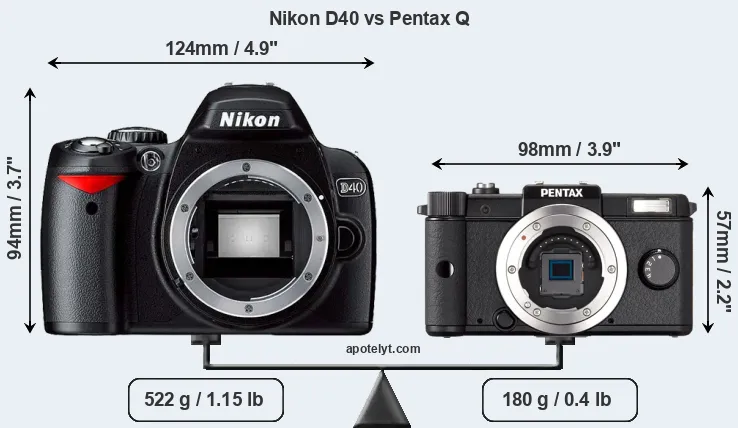 The physical size and weight of the Nikon D40 and the Pentax Q are illustrated in the side-by-side display below. The two cameras are presented according to their relative size. Three consecutive perspectives from the front, the top, and the back are available. All width, height and depth measures are rounded to the nearest millimeter.