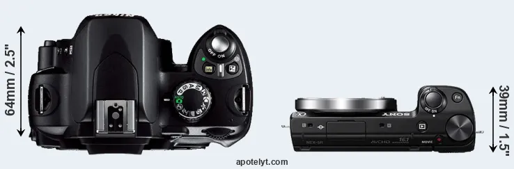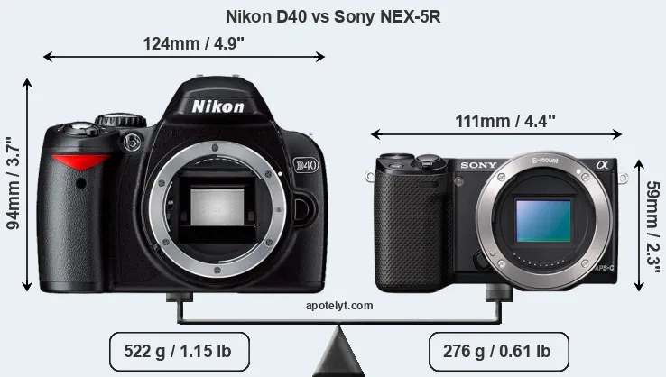 The physical size and weight of the Nikon D40 and the Sony NEX-5R are illustrated in the side-by-side display below. The two cameras are presented according to their relative size. Three consecutive perspectives from the front, the top, and the back are available. All width, height and depth dimensions are rounded to the nearest millimeter.