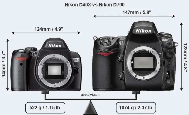 The physical size and weight of the Nikon D40X and the Nikon D700 are illustrated in the side-by-side display below. The two cameras are presented according to their relative size. Three consecutive perspectives from the front, the top, and the back are available. All width, height and depth dimensions are rounded to the nearest millimeter.