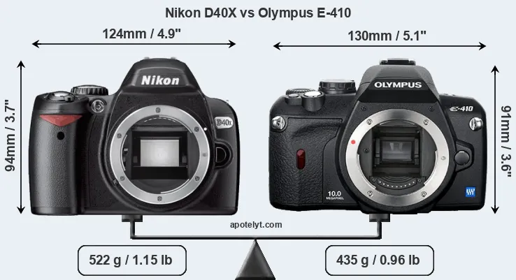The physical size and weight of the Nikon D40X and the Olympus E-410 are illustrated in the side-by-side display below. The two cameras are presented according to their relative size. Three successive views from the front, the top, and the rear are shown. All width, height and depth measures are rounded to the nearest millimeter.