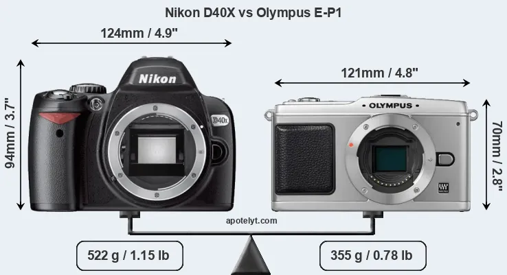 An illustration of the physical size and weight of the Nikon D40X and the Olympus E-P1 is provided in the side-by-side display below. The two cameras are presented according to their relative size. Three consecutive perspectives from the front, the top, and the back are available. All width, height and depth dimensions are rounded to the nearest millimeter.