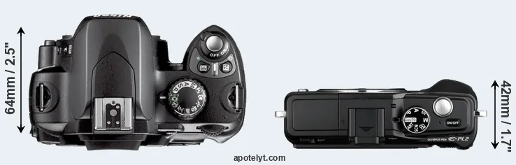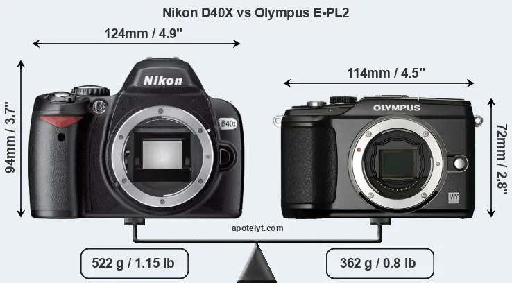 An illustration of the physical size and weight of the Nikon D40X and the Olympus E-PL2 is provided in the side-by-side display below. The two cameras are presented according to their relative size. Three consecutive perspectives from the front, the top, and the back are available. All size dimensions are rounded to the nearest millimeter.