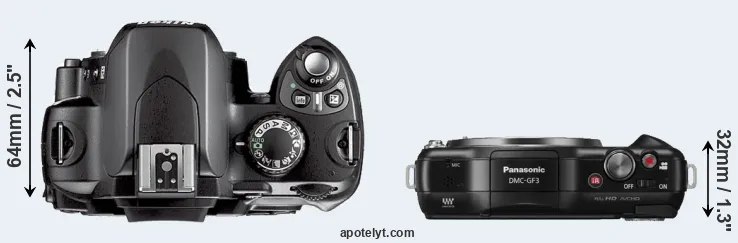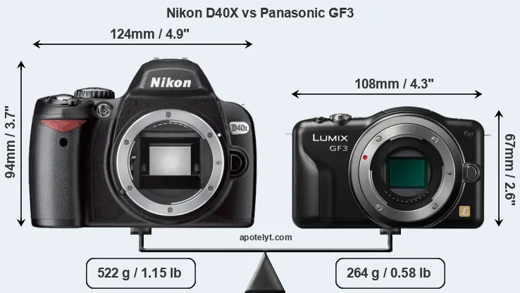 An illustration of the physical size and weight of the Nikon D40X and the Panasonic GF3 is provided in the side-by-side display below. The two cameras are presented according to their relative size. Three consecutive views from the front, the top, and the rear side are shown. All size dimensions are rounded to the nearest millimeter.