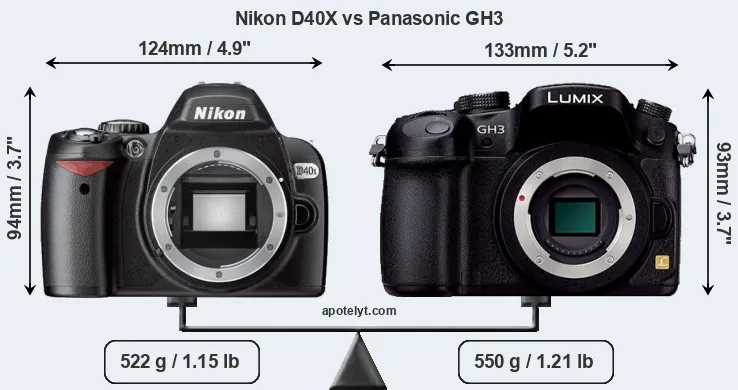 The side-by-side display below illustrates the physical size and weight of the Nikon D40X and the Panasonic GH3. The two cameras are presented according to their relative size. Three consecutive views from the front, the top, and the rear side are shown. All width, height and depth measures are rounded to the nearest millimeter.