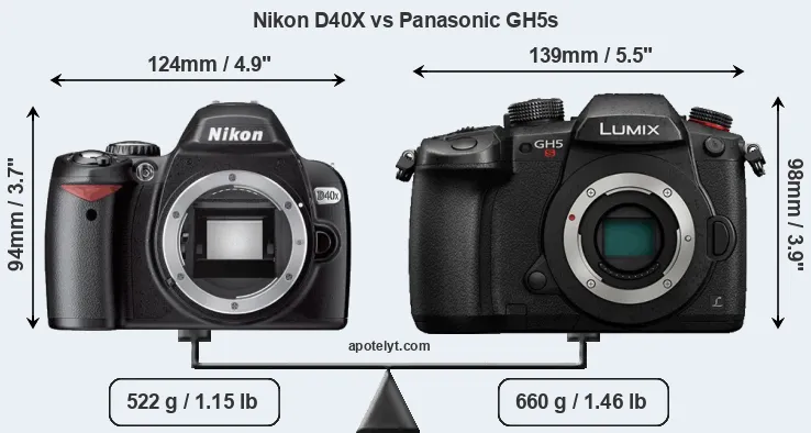 The side-by-side display below illustrates the physical size and weight of the Nikon D40X and the Panasonic GH5s. The two cameras are presented according to their relative size. Three consecutive perspectives from the front, the top, and the back are available. All size dimensions are rounded to the nearest millimeter.
