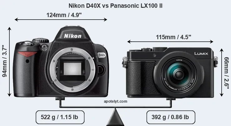 The above size and weight comparisons are to some extent incomplete and possibly misleading, as the LX100 II has a lens built in, whereas the D40X is an interchangeable lens camera that requires a separate lens. Attaching the latter will add extra weight and bulk to the setup. You can compare the optics available for the D40X and their specifications in the Nikon Lens Catalog.