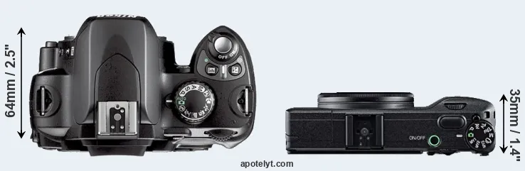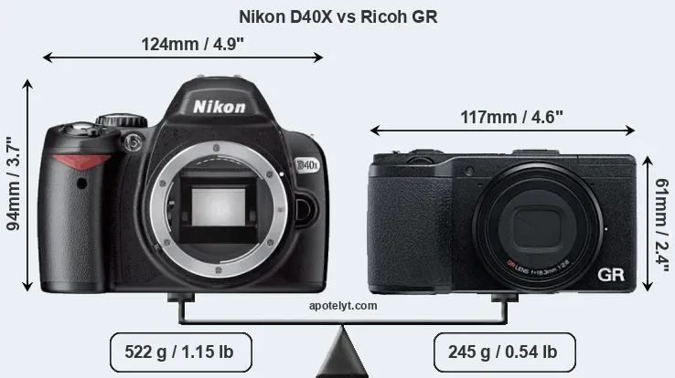 An illustration of the physical size and weight of the Nikon D40X and the Ricoh GR is provided in the side-by-side display below. The two cameras are presented according to their relative size. Three successive views from the front, the top, and the rear are shown. All width, height and depth dimensions are rounded to the nearest millimeter.