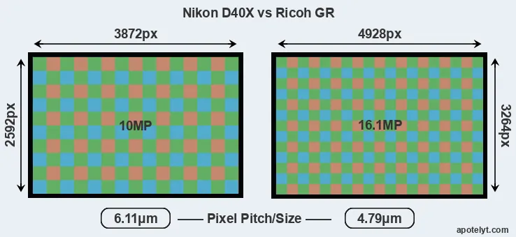 Despite having a slightly smaller sensor, the GR offers a higher resolution of 16.1 megapixels, compared with 10 MP of the D40X. This megapixels advantage comes at the cost of a higher pixel density and a smaller size of the individual pixel (with a pixel pitch of 4.79μm versus 6.11μm for the D40X). However, it should be noted that the GR is much more recent (by 6 years and 1 month) than the D40X, and its sensor will have benefitted from technological advances during this time that make it possible to gather light more efficiently. Coming back to sensor resolution, it should be mentioned that the GR has no anti-alias filter installed, so that it can capture all the detail its sensor resolves.