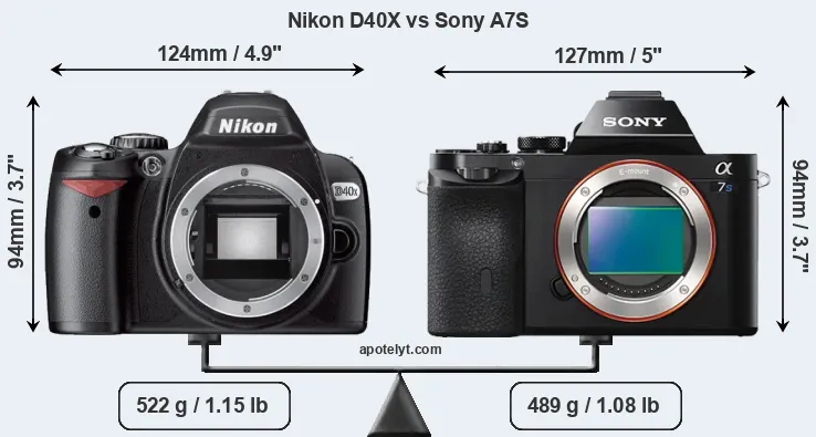 If the front view area (width x height) of the cameras is taken as an aggregate measure of their size, the Sony A7S is somewhat larger (2 percent) than the Nikon D40X. However, the A7S is markedly lighter (6 percent) than the D40X. It is noteworthy in this context that the A7S is splash and dust-proof, while the D40X does not feature any corresponding weather-sealing.