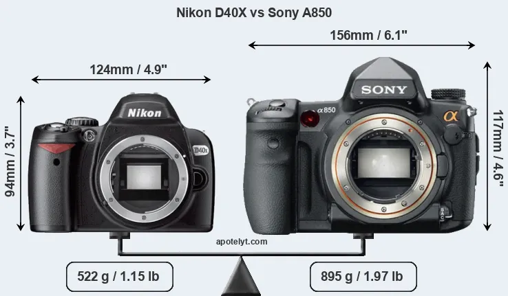 An illustration of the physical size and weight of the Nikon D40X and the Sony A850 is provided in the side-by-side display below. The two cameras are presented according to their relative size. Three consecutive perspectives from the front, the top, and the back are available. All size dimensions are rounded to the nearest millimeter.
