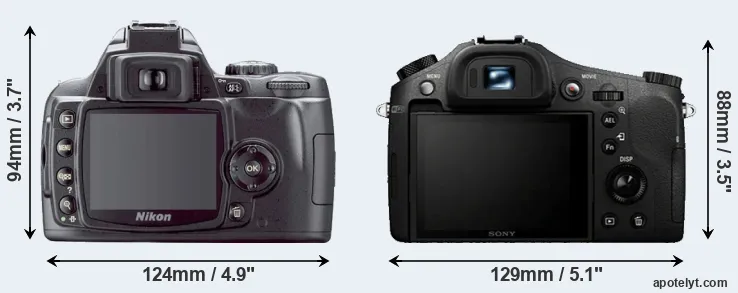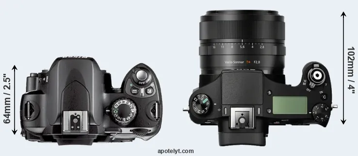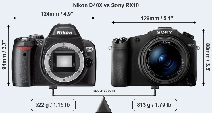 The side-by-side display below illustrates the physical size and weight of the Nikon D40X and the Sony RX10. The two cameras are presented according to their relative size. Three consecutive perspectives from the front, the top, and the back are available. All width, height and depth measures are rounded to the nearest millimeter.