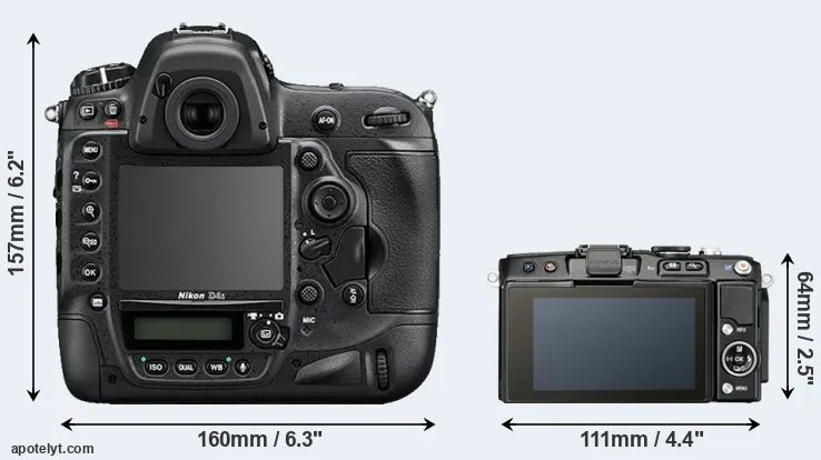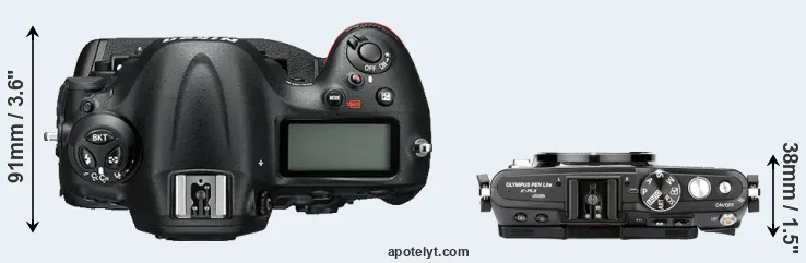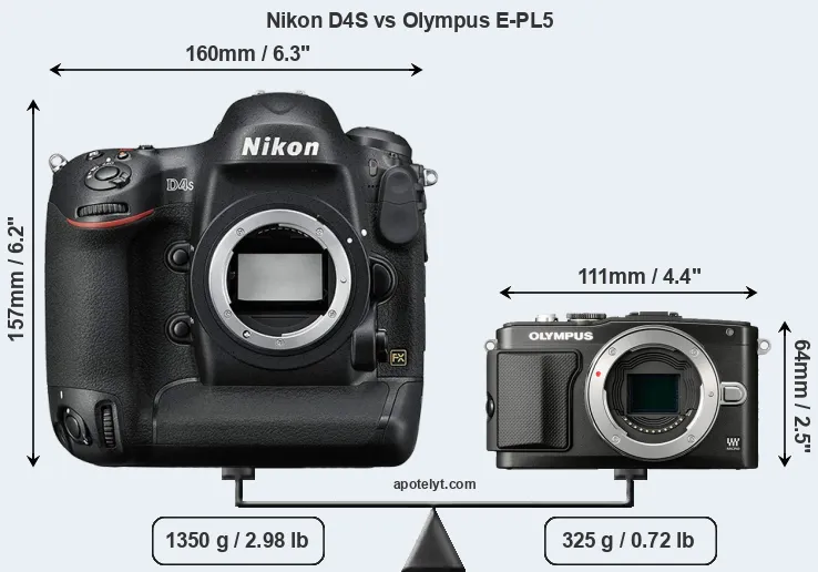 The side-by-side display below illustrates the physical size and weight of the Nikon D4S and the Olympus E-PL5. The two cameras are presented according to their relative size. Three consecutive perspectives from the front, the top, and the back are available. All width, height and depth measures are rounded to the nearest millimeter.