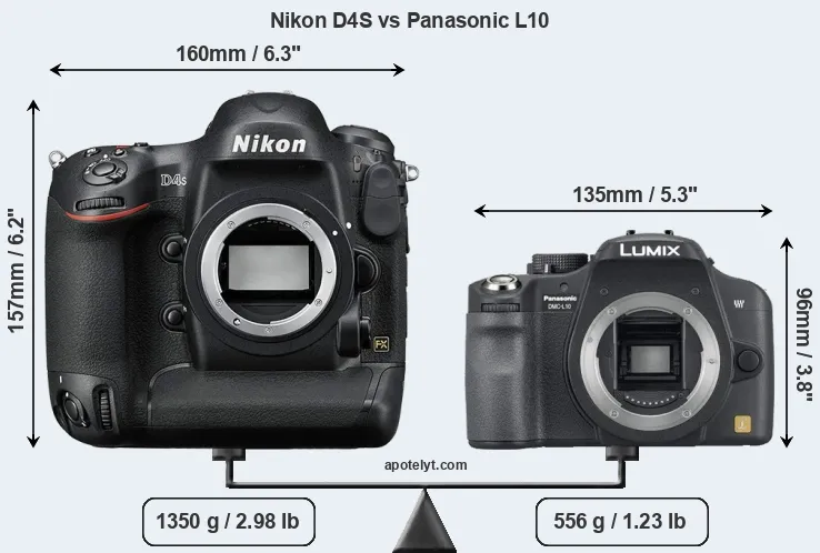 An illustration of the physical size and weight of the Nikon D4S and the Panasonic L10 is provided in the side-by-side display below. The two cameras are presented according to their relative size. Three consecutive views from the front, the top, and the rear side are shown. All size dimensions are rounded to the nearest millimeter.